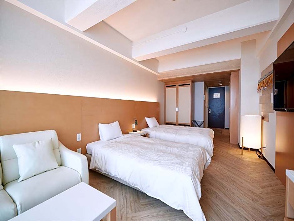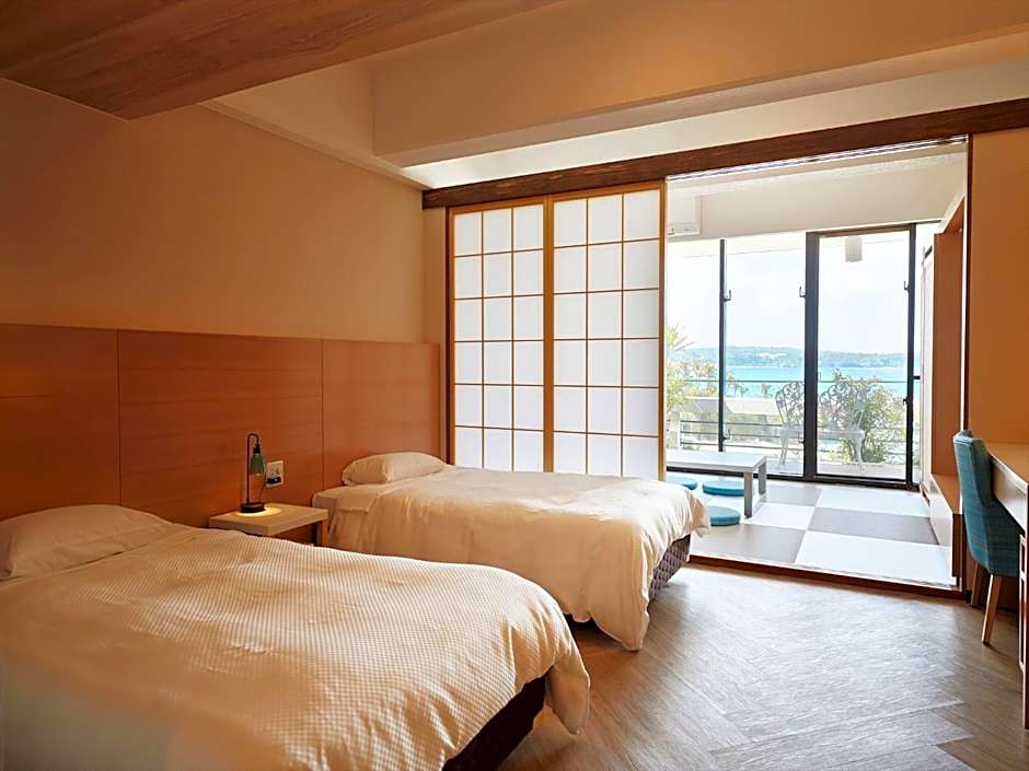 Air-conditioned rooms with Western-style beds and a tatami (woven-straw) seating area. Features ocean views, a flat-screen TV, a fridge, and an electric kettle with green tea bags. The private bathroom comes with a hairdryer and Japanese Yukata robes.