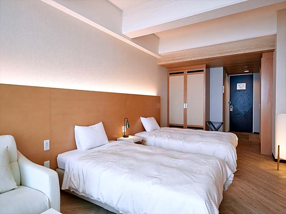 Air-conditioned rooms with Western-style beds and a tatami (woven-straw) seating area. Features a mountain view, a flat-screen TV, a fridge, and an electric kettle with green tea bags. The private bathroom comes with a hairdryer and Japanese Yukata robes.